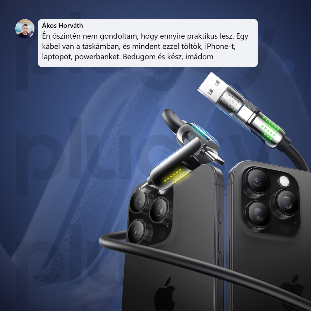 Legyen szó iPhone-ról, Androidról, laptopról vagy powerbankről, a Plugsy™ kábel mindenhez alkalmazkodik – egyetlen kábellel megoldasz mindent.